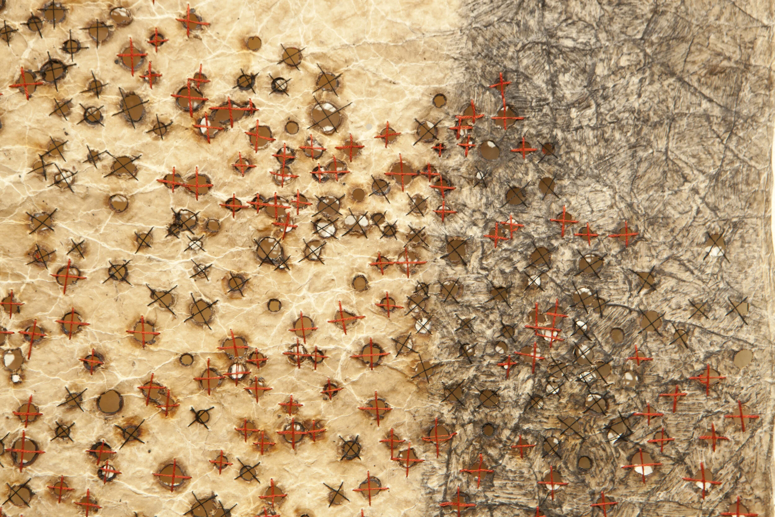 graphite, scraping, beeswax, pyrography, thread on waxed handmade Nepalese paper